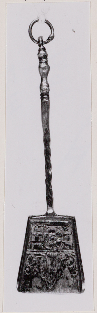 Korte haardschep met getorste steel en op de bak meegegoten versieringen- Trefwoorden