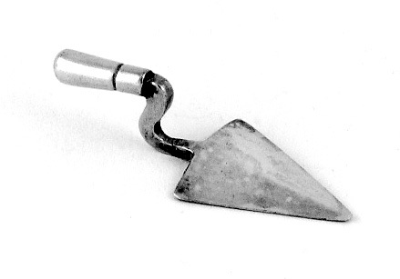 Troffel met puntig driehoekig blad en S-vormige steelaanzet met ronde greep.- Trefwoorden