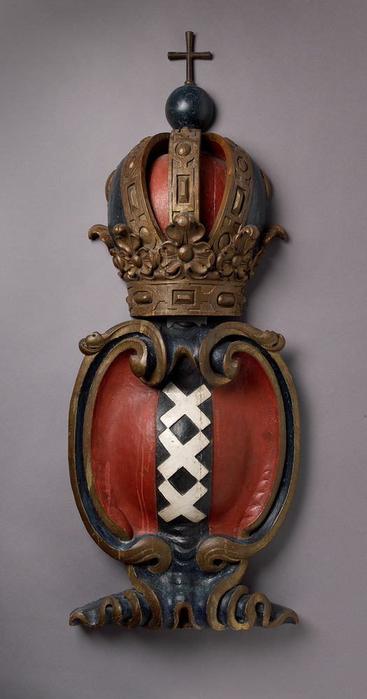 Eind 13e eeuw kreeg Amsterdam zijn eigen wapen; een rood bord met een verticale, zwarte streep met daarop drie kruizen. Er wordt gesuggereerd dat de kruizen ofwel Andreaskruizen zijn ofwel symbolen voor de grootste vijanden van de stad; water, vuur en de pest. In 1489 gaf Maximiliaan van Oostenrijk de Amsterdammers het recht om een koningskroon boven het stadswapen te plaatsen als dank voor de financiële en militaire steun die de stad aan de koning had verleend. Toen Maximiliaan tot keizer werd gekroond, veranderde de koningskroon in een keizerskroon. Dit stadswapen is overal zichtbaar in de stad. Het stadswapen dat u hier ziet, is waarschijnlijk afkomstig uit het Raffineer- of Stadssalpeterhuis, dat in 1647 werd gebouwd en in de 19e eeuw werd afgebroken. In het huis werd van salpeter buskruit gemaakt dat afkomstig was uit Zuid-Amerika, China, India en Spanje. Amsterdam nam een belangrijke plaats in in de handelsmarkt en stapelplaats voor salpeter.