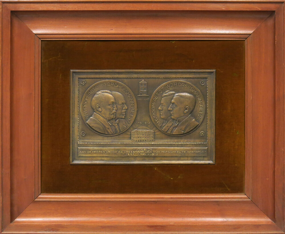 Bronzen plaquette van de stichters W.H. Vroom en A.C.R. Dreesmann en hun opvolgers B.H. Vroom en W. Dreesmann, aangeboden door het personeel van V&D Amsterdam ter gelegenheid van het 25-jarig bestaan op 1 mei 1912, 1912