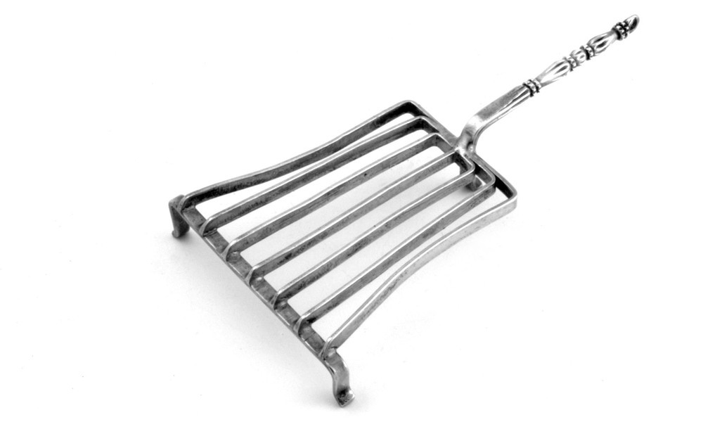 Trapeziumvormige treeft met zeven spijlen, waarvan de buitenste naar binnen zijn geknikt, ronde aangezette geprofileerde en geribte steel, eindigend met een oog.- Trefwoorden