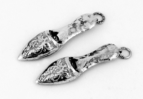 Een paar puntige Oosterse muiltjes, beide aan de hak voorzien van een oogje met ring, de zool en hak bewerkt; mogelijk buitenlands souvenir of breipenhouders.