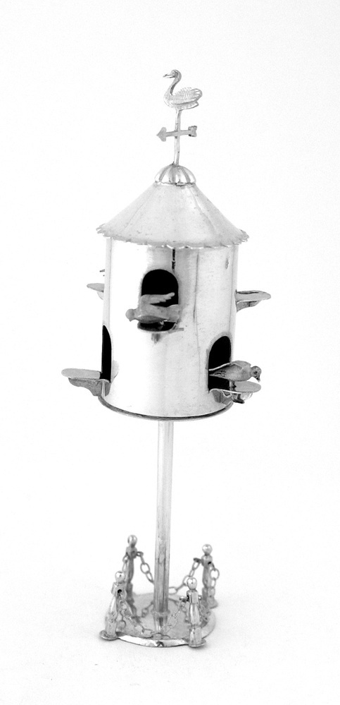 Ronde duiventil op standaard en voetstuk met vier paaltjes met kettingen