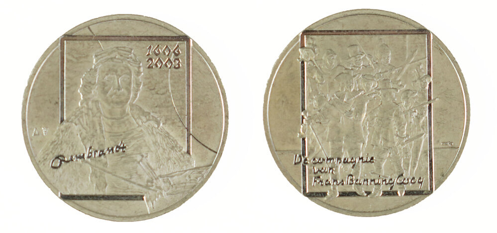 Deze zilveren penning uit 2003 toont aan de voorzijde een ‘ingelijst’ portret van de Nederlandse schilder Rembrandt van Rijn (1606-1669) met zijn beroemde handtekening. In de rechter bovenhoek van de lijst zijn de jaartallen 1606 en 2003 te lezen. Op de keerzijde van de penning is, eveneens door een vierkant kader ingelijst, een gedeelte van ‘De compagnie van kapitein Frans Banning Cocq’, beter bekend als ‘De Nachtwacht’, afgebeeld. Wellicht was deze penning een voorstudie voor de penning die de Koninklijke Nederlandse Munt in 2006 uitgaf ter gelegenheid van het Rembrandtjaar. ( Sarah Remmerts de Vries)