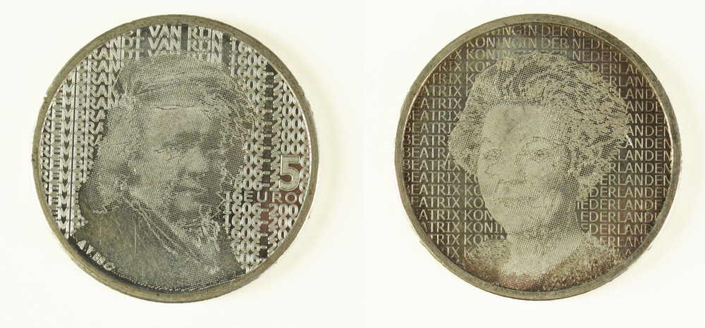 Deze zilveren vijf euromunt, het zogenaamde ‘Rembrandt Vijfje’, is uitgegeven ter gelegenheid van de 400ste geboortedag van de Nederlandse schilder Rembrandt van Rijn (1606-1669) in 2006. Rembrandt is waarschijnlijk de beroemdste kunstschilder uit de Gouden Eeuw. Zijn meesterwerk De Nachtwacht uit 1642 trekt bezoekers van over de hele wereld naar het Rijksmuseum. Ook het Amsterdamse Rembrandtplein, één van de grote uitgaansgebieden van de stad, draagt sinds 1876 zijn naam. In het Rembrandtjaar 2006 werden tal van tentoonstellingen en activiteiten georganiseerd om te vieren dat Rembrandt 400 jaar geleden in Leiden geboren werd. De voorzijde van de penning toont een portret van Rembrandt voor een achtergrond met tekst, waarin zijn naam en de jaartallen 1606 – 2006 te lezen zijn. Op de keerzijde is een portret van prinses Beatrix te zien voor een soortgelijke achtergrond, met de tekst ‘Beatrix Koningin der Nederlanden’. ( Sarah Remmerts de Vries)