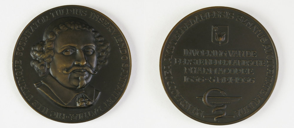 Deze bronzen penning is vervaardigd ter gelegenheid van het derde eeuwfeest van de invoering van de eerste Nederlandse farmacopee in 1936. Een farmacopee is een receptenboek met voorschriften voor het maken van medicijnen. De eerste nationale farmacopee, de Pharmacopoea Amstelredamensis, is uitgegeven in 1636 op initiatief van de Amsterdamse arts en burgemeester Nicolaes Tulp (1593-1674). Het is dan ook Tulp die afgebeeld is op de voorzijde van deze penning. Om hem heen is de Latijnse tekst HIC ILLE UTRINQUE SOSPITATOR TULPIUS INSERVIENDO SANITATI ET PATRIAE (‘Dit is Tulp, beschermer van de gezondheidszorg en het vaderland’) te lezen. De keerzijde van de penning toont eveneens een Latijnse tekst: PHARMACOPOEA AMSTELREDAMENSIS SENATUS AUCTORITATE MUNITA (‘Het gezag van de senaat is verrijkt door de Pharmacopoea Amstelredamensis’). Een tekst in het midden van de keerzijde herinnert aan het derde eeuwfeest van de invoering van de farmacopee. Tot slot zijn hier nog een wapen van de familie Tulp en een esculaap te zien, de laatste afgebeeld met een bokaal in plaats van een staf. ( Sarah Remmerts de Vries)