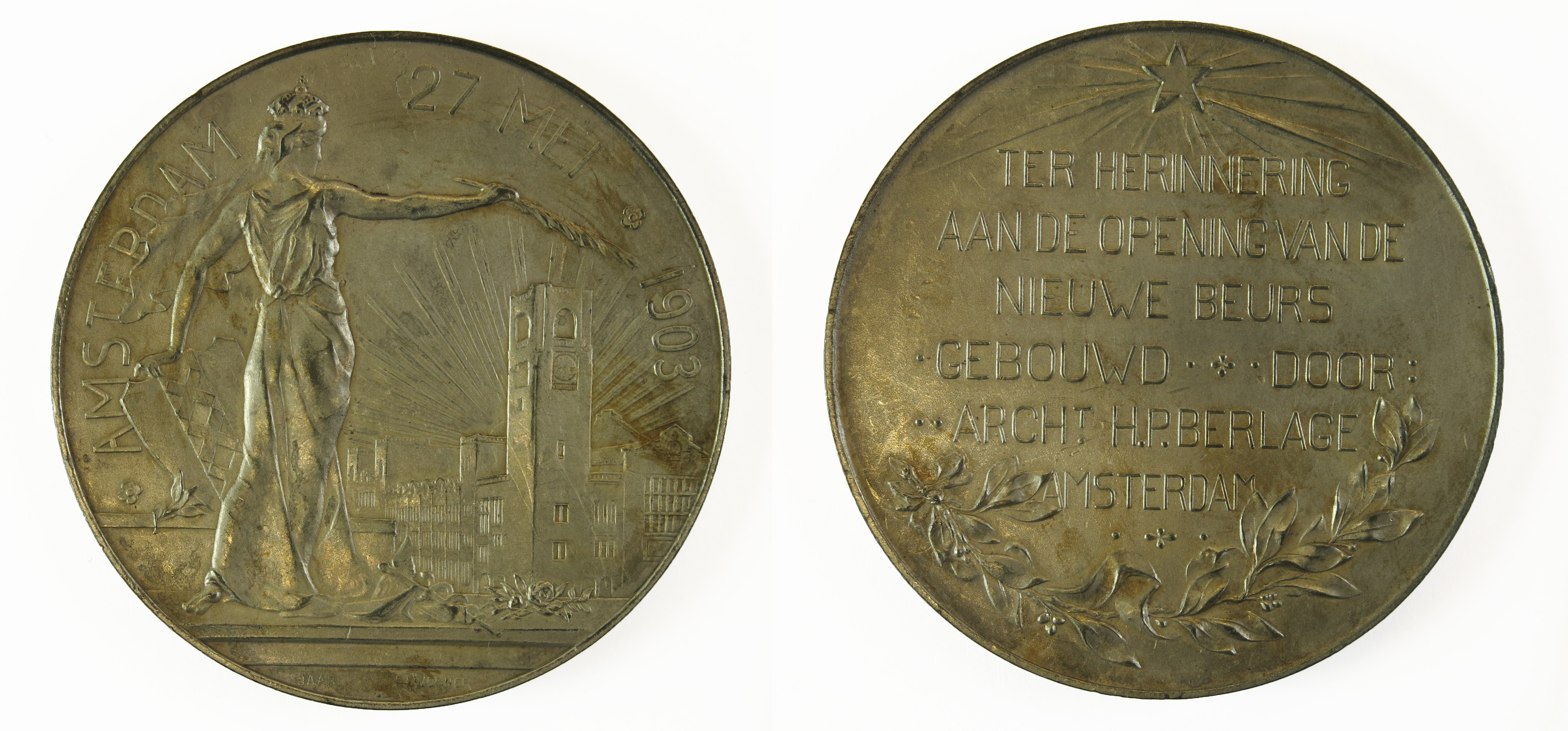 De Beurs van Berlage was in Amsterdam het derde beursgebouw op rij. Het eerste werd in 1611 gebouwd door Hendrick de Keyser en stond aan de Vijgendam, op de hoek van Dam en Rokin. In 1845 verrees een nieuw beursgebouw naar een ontwerp van J.D. Zocher dat aan de noordzijde van de Dam kwam te staan, waar zich nu de Bijenkorf bevindt. Na de opening van het Noordzeekanaal in 1876 beleefde Amsterdam een enorme economische opleving en ontstond een behoefte aan een groot, modern gebouw waar alle beursactiviteiten ondergebracht konden worden. De stad Amsterdam gaf de architect H.P. Berlage opdracht om een nieuw Koopmansbeurs te bouwen en op 27 mei 1903 werd het nieuwe Beursgebouw door koningin Wilhelmina officieel geopend. De medailleur F.J. Werner werd gevraagd voor de penning ter gelegenheid van de opening. Ook voor de openingen van de eerdere beursgebouwen waren er penningen uitgebracht. Op de penning van Werner leunt de Amsterdamse stedemaagd, op de rug gezien, met haar linkerhand op het wapenschild van Amsterdam. Zij houdt met haar rechterhand een palmtak boven het door zonnestralen omkranste nieuwe gebouw. ( Judith van Gent)