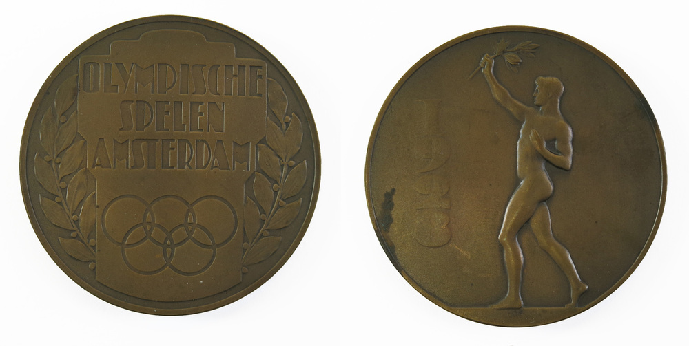 keerzijde: een gesyleerd veld met de ringen van de Olympische Spelen waarboven een opschrift, tussen twee lauwertakken.
