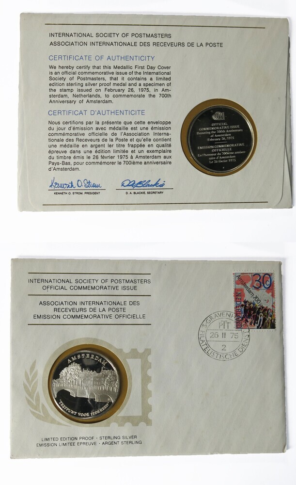 - Amsterdam trefpunt voor iedereen, gedenkpenning bij 700-jarig bestaan van Amsterdam, in eerstedagenvelop met Amsterdam 700-zegel, 1975