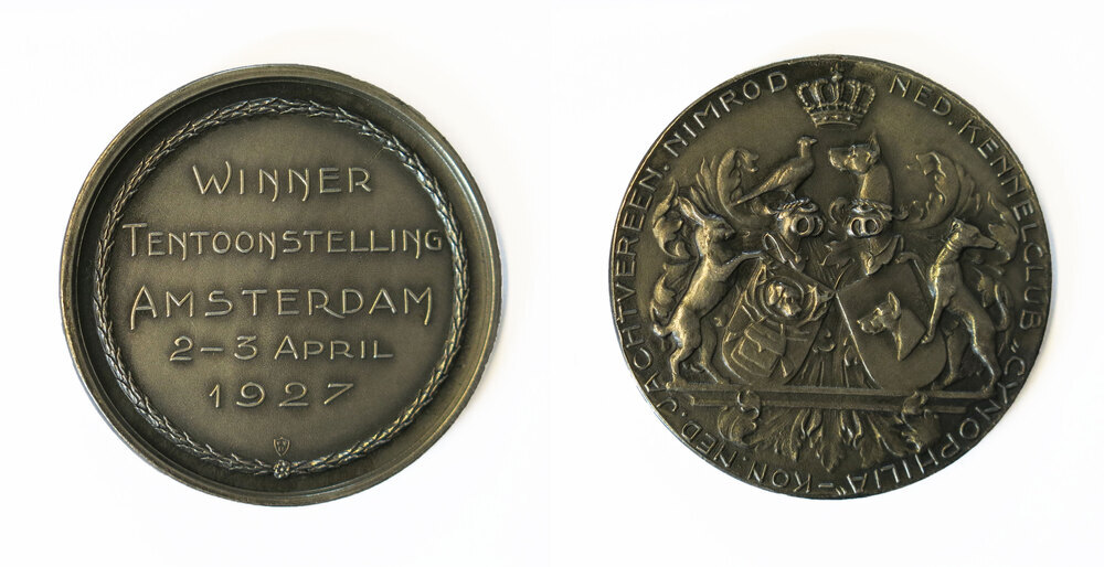 Het veredelen en fokken van rashonden resulteerde in de negentiende eeuw tot een nieuw fenomeen: de hondententoonstelling. De - nog steeds bestaande - Koninklijke Nederlandse Kennelclub 'Cynophilia' organiseerde vanaf 1890 een lange reeks hondententoonstellingen. Deze bronzen penning memoreert de tentoonstelling die de club samen met de Nederlandse Jachtvereniging 'Nimrod' in april 1927 organiseerde in Amsterdam. ( Annemarie den Dekker)