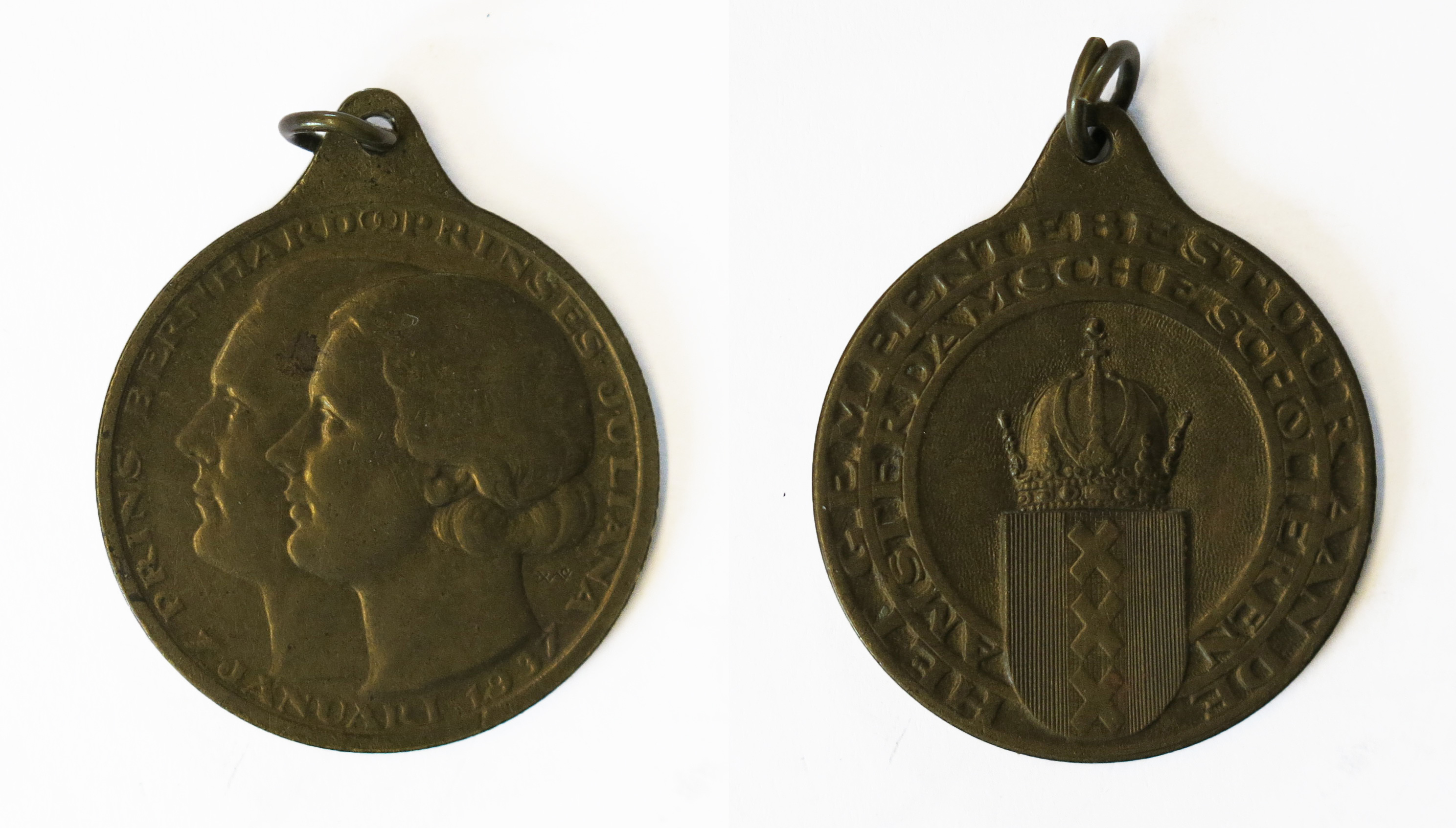 Draagpenning, aan de Amsterdamse scholieren uitgereikt ter gelegenheid van het huwelijk van Prinses Juliana met Prins Bernhard van Lippe Biesterfeld op 7 januari 1937. Op de voorzijde de portretten en profil van het bruidspaar. Op de keerzijde het stadswapen. ( Judith van Gent)