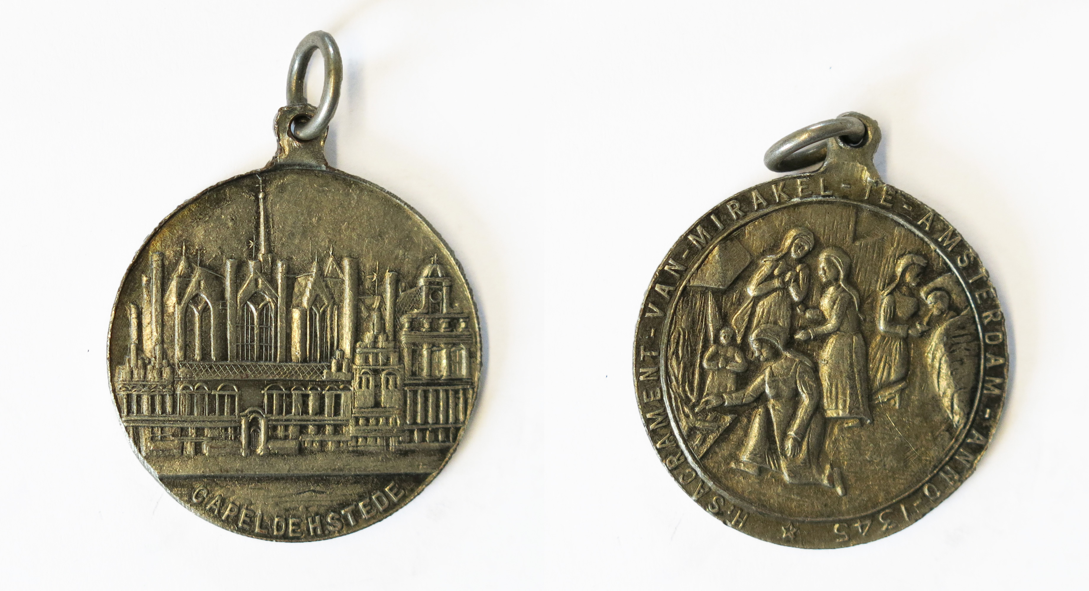 Zeshonderdjarig jubileum van het Sacrament van het Mirakel te Amsterdam, 1946 zilver hoogte: 3.5 cm; breedte: 3.0 cm; diepte: 0.2 cm; gewicht: 14.2 gr; opschrift voorzijde: H. SACRAMENT VAN MIRAKEL TE AMSTERDAM ANNO 1345