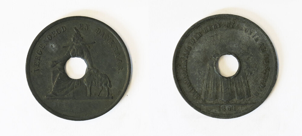 keerzijde: in een omschrift liggen twee gekruiste broden op een afgerokte tafel. In het midden heeft de penning een gat. In de afsnede een jaartal.
