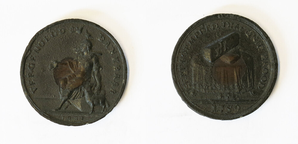 keerzijde: in een omschrift liggen op een gerokte tafel twee broden gekruist over elkaar, met een opschrift op de bovenste. In de afsnede een jaartal.