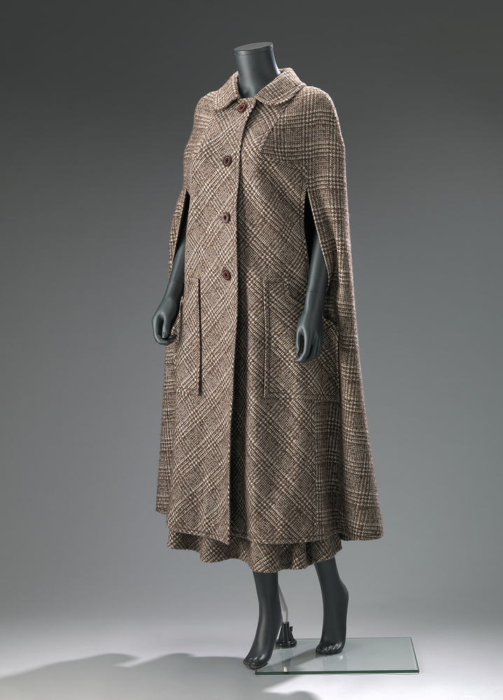 Dit ensemble is ontworpen door Max Heymans (1918-1997), een van de belangrijkste Nederlandse couturiers. Hij werkte vanaf de jaren dertig van de twintigste eeuw in Amsterdam, als hoedenmaker voor onder meer Maison de Bonneterie en etaleur voor modemagazijn Hirsch & Cie. In de jaren vijftig en zestig werd Heymans in het hele land bekend met zijn flamboyante kledingcreaties in de stijl van zijn Franse voorbeeld Coco Chanel. Heymans bleef maar liefst vijftig jaar lang actief als couturier en showde in deze tijd ruim 8000 verschillende creaties. Zijn werk was altijd geïnspireerd op de nieuwste Parijse mode en is wel eens omschreven als 'très Paris' en 'doodchic'. Dit ensemble bestaat uit een cape, rok en sjaal in zwart-wit geruite stof. De cape fungeert, eventueel in combinatie met de sjaal, als een jas voor buiten. ( Sarah Remmerts de Vries)