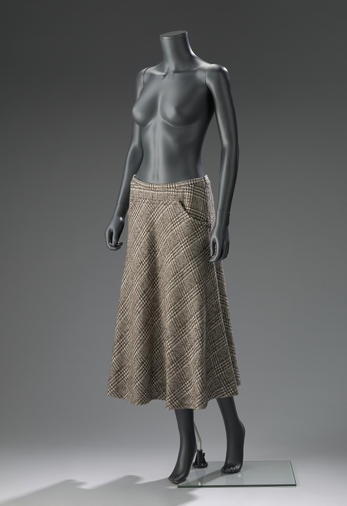 Dit ensemble is ontworpen door Max Heymans (1918-1997), een van de belangrijkste Nederlandse couturiers. Hij werkte vanaf de jaren dertig van de twintigste eeuw in Amsterdam, als hoedenmaker voor onder meer Maison de Bonneterie en etaleur voor modemagazijn Hirsch & Cie. In de jaren vijftig en zestig werd Heymans in het hele land bekend met zijn flamboyante kledingcreaties in de stijl van zijn Franse voorbeeld Coco Chanel. Heymans bleef maar liefst vijftig jaar lang actief als couturier en showde in deze tijd ruim 8000 verschillende creaties. Zijn werk was altijd geïnspireerd op de nieuwste Parijse mode en is wel eens omschreven als 'très Paris' en 'doodchic'. Dit ensemble bestaat uit een cape, rok en sjaal in zwart-wit geruite stof. De cape fungeert, eventueel in combinatie met de sjaal, als een jas voor buiten. ( Sarah Remmerts de Vries)