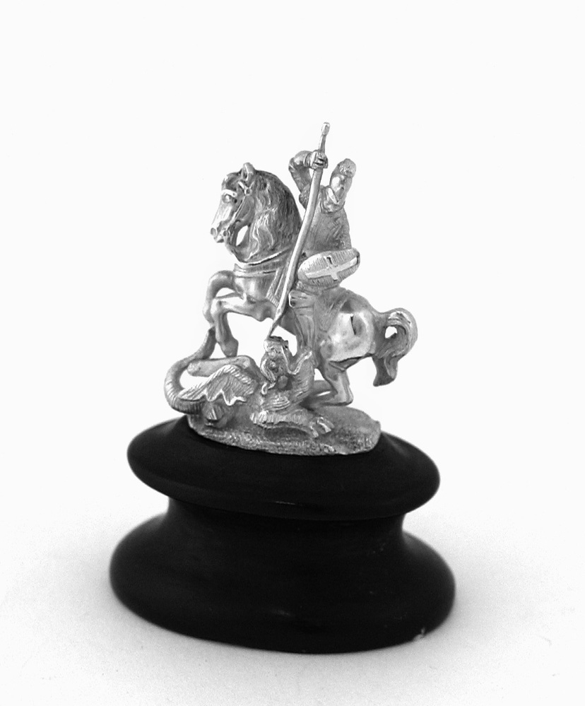 Ridder te paard met lans en draak op zwart ovale sokkeltje- Trefwoorden