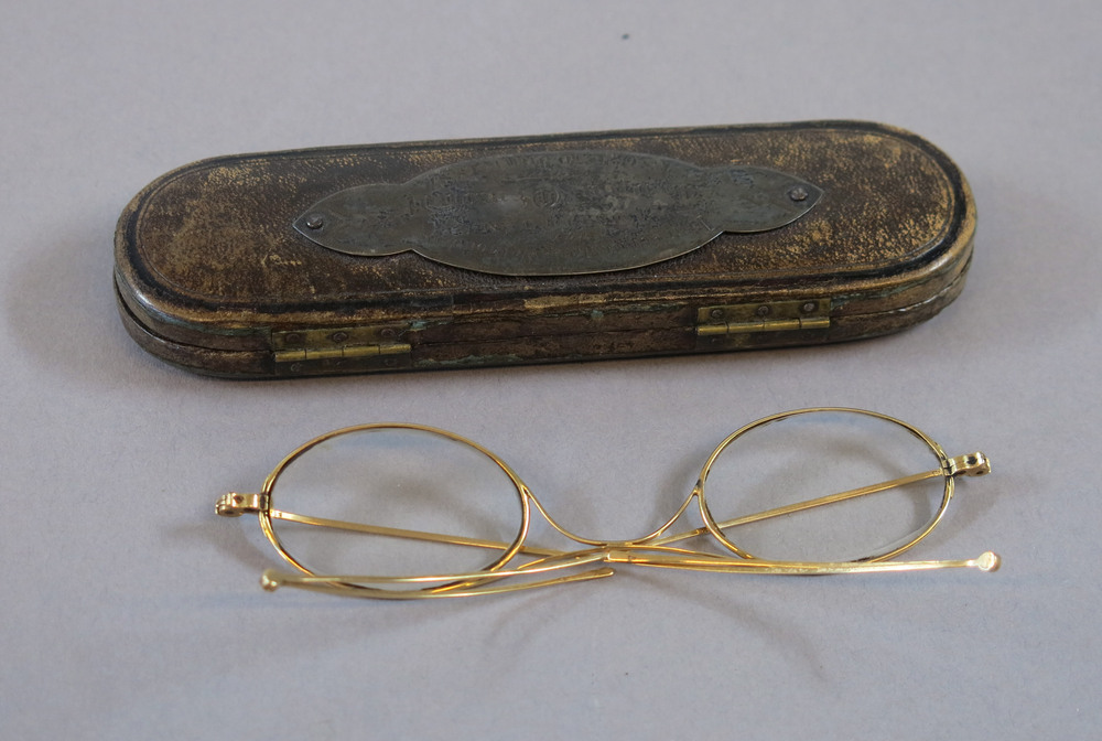 Deze dunne bril met koker is op 30 juni 1887 door Burgemeester en Wethouders van Amsterdam aan Joannes van Ormondt geschonken, ter gelegenheid van zijn vijfentwintigjarig jubileum als medewerker bij de gemeentebelastingen. De bril is gemaakt van goudkleurig metaal en kent ovale glazen. De pootjes van de bril zijn inklapbaar, waardoor de bril gemakkelijk opgevouwen en vervoerd kan worden. Dit model bril was destijds zeer gangbaar. ( Sarah Remmerts de Vries)