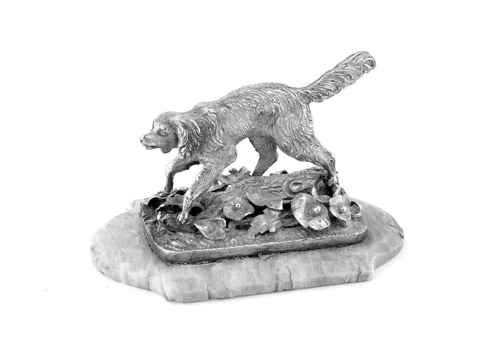 Hond op voetstuk versierd met bloemen, het geheel rustend op een beige marmeren bodemplaatje- Trefwoorden