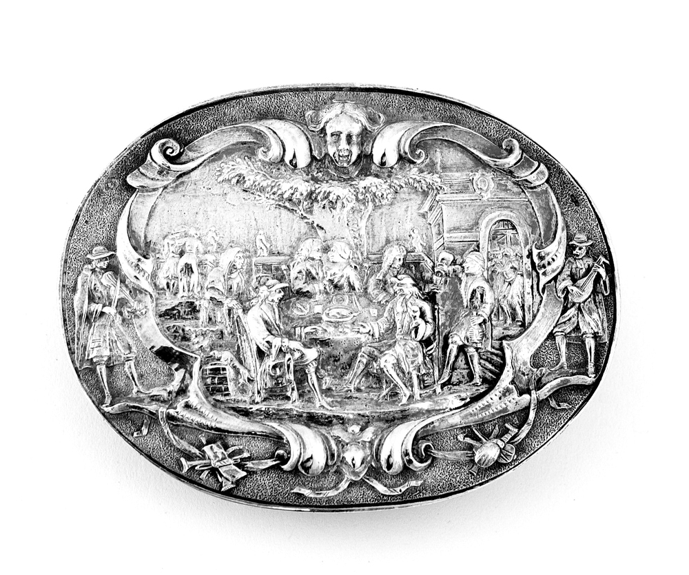 Ovaal reliëf met afbeelding van een feestmaal met aan weerszijden een muzikant en boven een cherubijn tussen een lintversiering; de onderzijde bezet met jachtatributen.