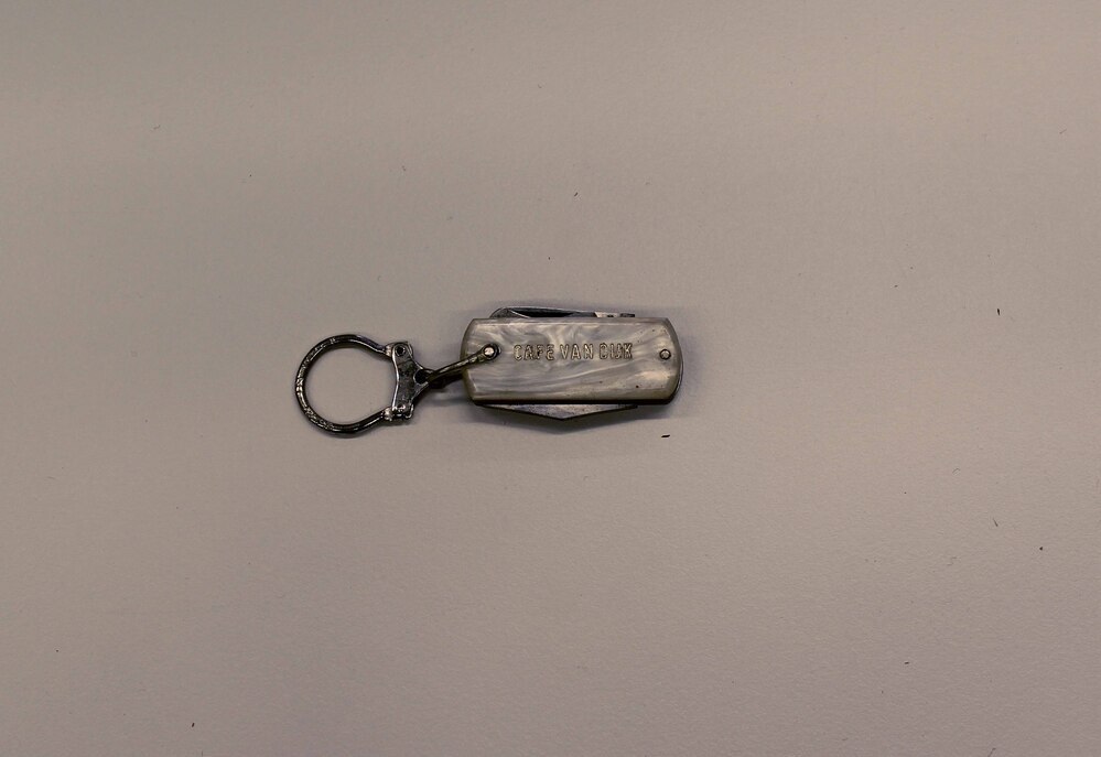 - Chinese boedel, inhoud schooltas, zakmes als sleutelhanger met opdruk 'CAFE VAN DIJK', 1950 - 1975