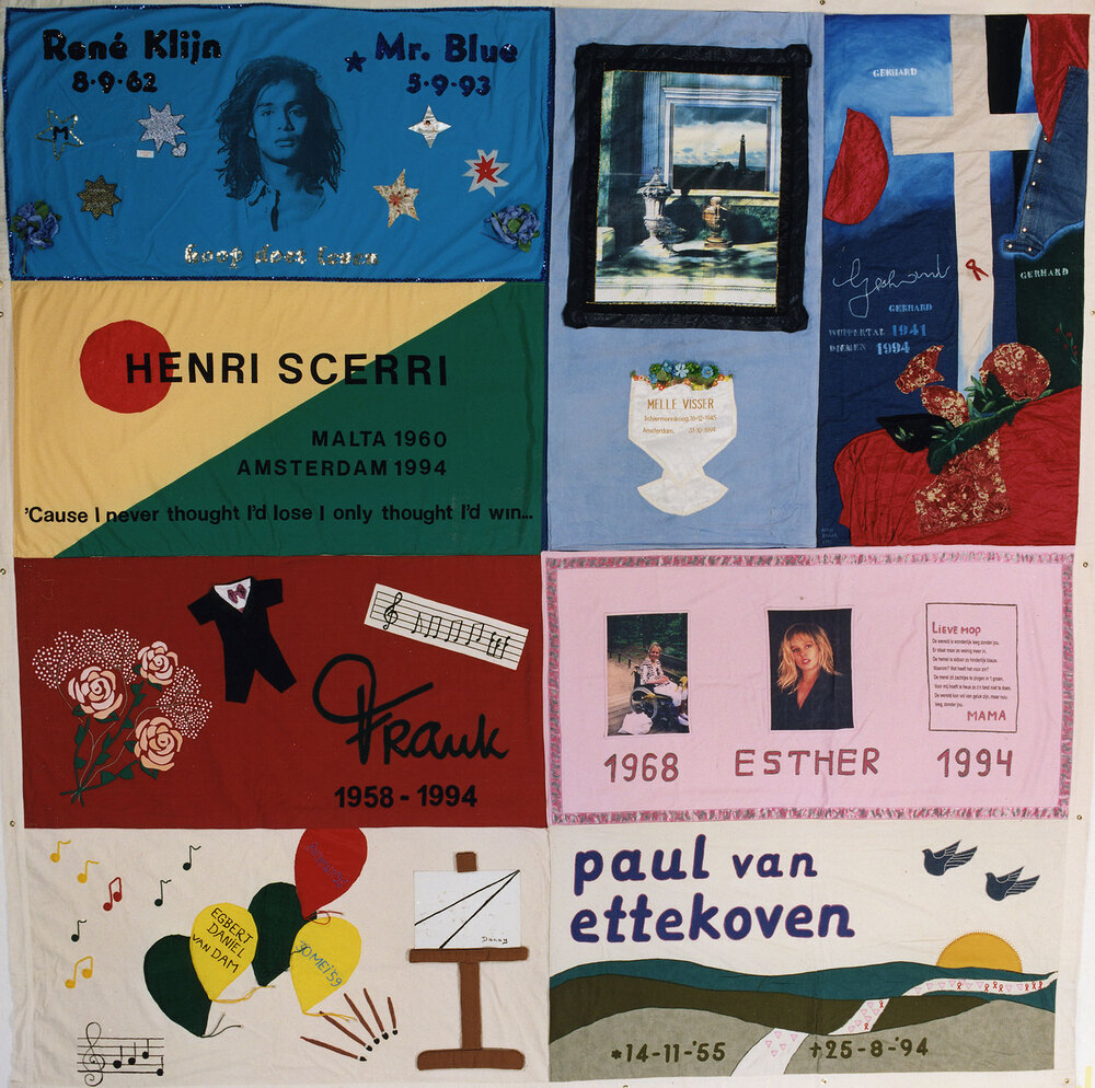 De eerste gevallen van aids werden begin jaren ’80 geconstateerd. Geïnspireerd door het Amerikaanse voorbeeld begonnen mensen in Nederland naamvlaggen voor de slachtoffers te maken. Deze naamvlaggen vormen samen quiltblokken, die gecombineerd een grote Aids Memorial Quilt maken. In 1988 vervaardigde Gart Zeebregts de eerste Nederlandse naamvlag, gewijd aan de in Amsterdam overleden Russische pianist Youri Egorov. Op de vrieskoude Wereldaidsdag in december 1988 presenteerden nabestaanden de eerste Nederlandse naamvlaggen op de Dam in Amsterdam. Begin jaren '90 groeide de Nederlandse Aids Memorial Quilt snel. Inmiddels zijn er 29 en een halve quiltblokken gemaakt voor ongeveer 350 mensen die zijn overleden aan aids. Dat is 8% van de grofweg 4500 Nederlandse aidsslachtoffers. De Nederlandse quiltblokken worden op het moment ondergebracht in verschillende musea, waaronder het Amsterdam Museum. ( Sarah Remmerts de Vries)