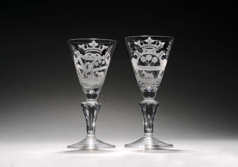 Dit gegraveerde wijnglas toont het wapen van Johanna Elisabeth Blesen (1695-1738). Op de andere zijde is een gekroond spiegelmonogram te zien, met aan weerszijden een lauwertak en in het midden Blesens vervlochten initialen: JEB of JB. Blesen trouwde in 1717 met Godefridus Franciscus Cromhout (1695-1764). Godefridus is een directe afstammeling van stamvader Adriaen Cromhout (ca. 1516-1588), de eerste gereformeerde burgemeester van Amsterdam. Na hun huwelijk gaat het echtpaar wonen in het ouderlijk huis van Johanna aan de Herengracht, het huidige nummer 436. Slechts een paar grachtenpanden verder staat het huis waar Godefridus is opgegroeid: Herengracht 368, het huidige Cromhouthuis. ( Sarah Remmerts de Vries)