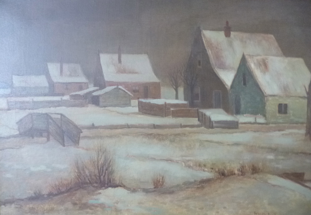 Dit winterse landschap toont een zeldzame blik op een verdwenen stukje Amsterdam. De Amsterdamse kunstenaar Willem (Wilhelm Heinrich) Klijn (1892-1961) stond waarschijnlijk op een zandophoping aan de Jan van Galenstraat toen hij deze voorstelling vastlegde. De afgebeelde tuindershuizen lagen destijds aan de rand van de stad, even ten noorden van de Jan Evertsenstraat. Vóór de annexatie door Amsterdam in 1921 lagen ze nog in de gemeente Sloten. In de tijd waarin Klijn zijn schilderij maakte, verrees aan de Jan van Galenstraat nieuwbouw, vandaar de zandhoop. Op de plek van de polder is later het Erasmuspark aangelegd. ( Sarah Remmerts de Vries)