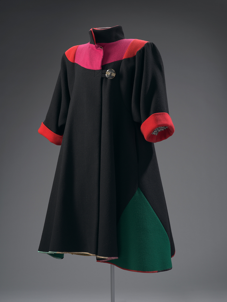 Jas van wol in zwart, roze, rood en groen. Wijde mantel in A-lijn model. Zwarte opstaande kraag met aan de binnenzijde rode wol. Schouderpas aan voor-en achterzijde van roze wol en op de schouders rode wol. De jas heeft schoudervullingen. Wijde zwarte mouwen met onderaan een omgeslagen manchet van rode wol. De zwarte stof is middenachter gerimpeld aan de roze schouderpas gezet. In de zijnaden steekzakken. Vanuit de zijnaden een driehoek van groene wol. De jas is onderaan afgebiest in de kleuren: geel, beige, roze, rood, zwart, groen en donkerroze. Blinde sluiting (rechts over links) bovenaan bij schouderpas met knoopsgaten en twee parelmoeren knopen. Daaronder op het zwarte gedeelte een grote bruin/zwart gevlekte knoop en lus.