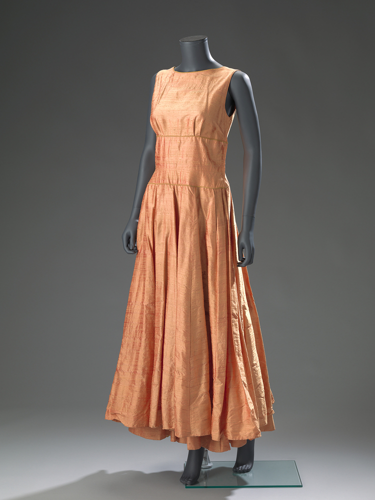 Avondjurk van geel/rode changeant zijde, afgezet met goudkleurig lurex koordje. Ronde hoogesloten hals. Mouwloos model met glad lijfje. De armsgaten zijn afgewerkt met een vulkoord. Onder de buste twee figuurnaden. Aan de achterzijde brede schouderbanden en open rug met vierkante uitsnijding. Langs de hals, onder de buste en onder de taille versierd met een goudkleurig lurex koordje. Wijd uitlopende lange rok, bestaande uit 10 banen. In de zijnaden op heuphoogte twee steekzakken. Onderrok van gele voeringsstof met onderaan een strook zijde. De onderrok is langer dan de bovenrok. Het lijfje is gevoerd met lichtgeel en donkergele voeringsstof. Sluiting in linkerzijnaad met crèmekleurige kunststof rits met metalen loper. Bovenaan sluitend met metalen haak en oog.