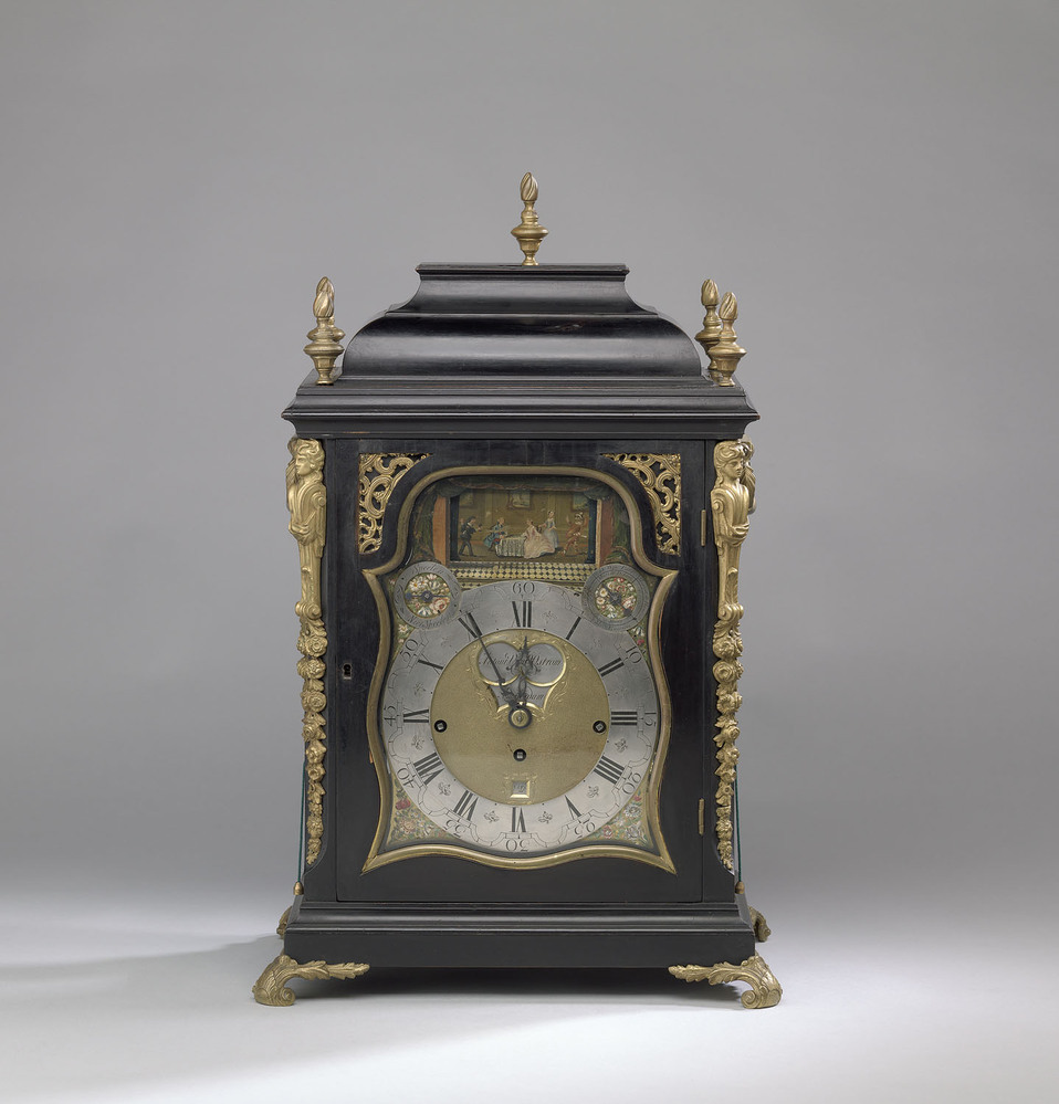 tafelklok met spillegang, slagwerk op hele- en halve uren, speelwerk met verschillende melodiën. De kast deels belijmd met ebbenfineer, de hoeken versierd met bronsbeslag; kariatyden boven bloemornamenten, kast staand op vier pootjes van accantusblad, de hoeken op de kast en in het midden opgesierd met een gevlamd pinakel.