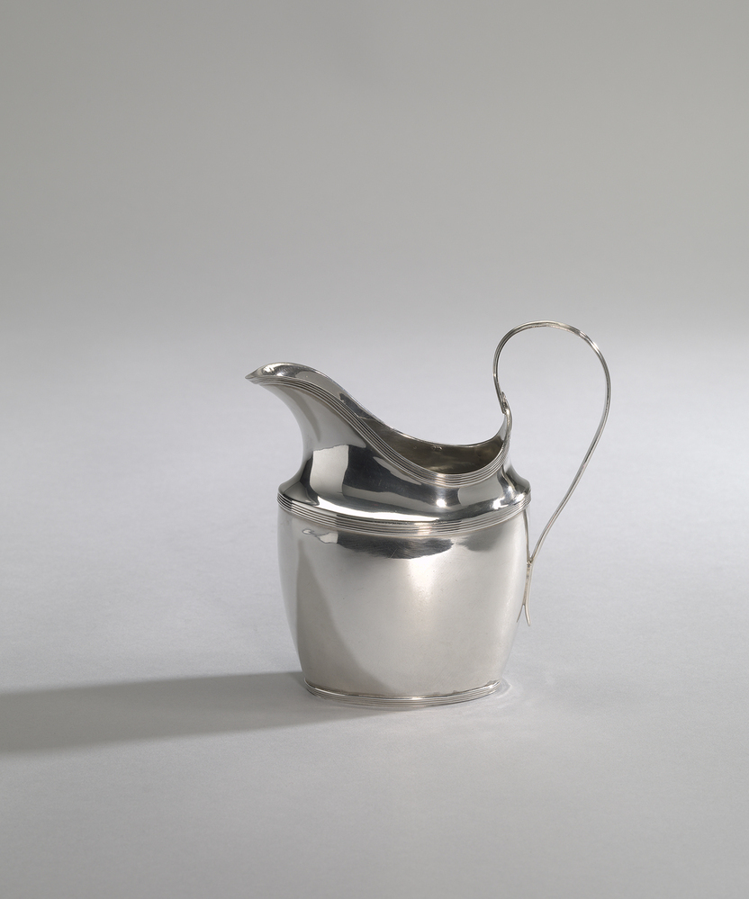 Een ovale melkkan, met opstand oor, filetranden langs de rand aan boven- en onderzijde.- Trefwoorden