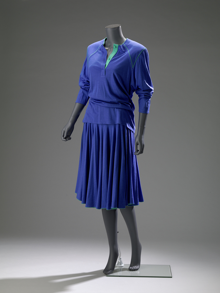 Shirt van donkerblauwe en groene tricot van een mengweefsel acryl en wol. Recht model met ronde hals. Middenvoor een split met groene strook, sluitend met twee groene stofovertrokken knopen. De schouders hebben een inzet, verstevigd met dubbele stof en vlieseline(?). Langs de hals, inzet en schoudernaden een groene bies (piping). Lange smal toelopende mouwen met lage mouwinzet. Op heuphoogte twee ronde steekzakken.