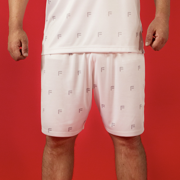 Korte broek voor een man van witte polyester tricot, bedrukt met een motief van de lichtgrijze letter 'F'. Tailleband met elastiek en wit rijgkoord met rode kunststof nestels. Rechte pijpen.