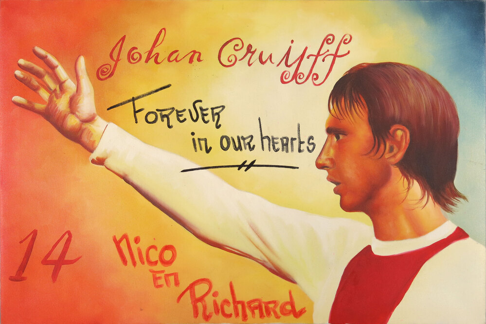 Johan Cruijff, forever in our hearts (achtergelaten door fans van Johan Cruijff bij zijn ouderlijk huis in Betondorp na het overlijden op 24 maart 2016)