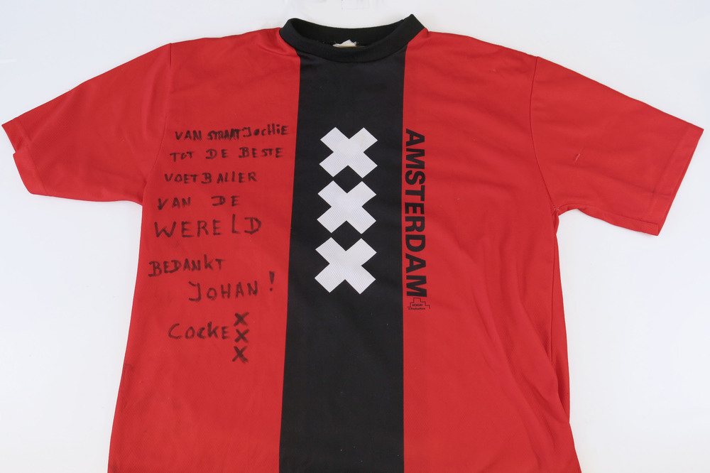 Rood katoenen shirt met gecentreerde verticale baan in zwart, waarin drie onder elkaar geplaatste witte andreaskruisen. Ter linkerborstzijde, naast de zwarte baan, de gedrukte tekst AMSTERDAM. Ter rechterborstzijde is in zwarte letter handgeschreven tekst aangebracht: "VAN STRAATJOCHIE/ TOT DE BESTE/ VOETBALLER/ VAN DE/ WERELD/ BEDANKT/ JOHAN!/ X/ COCKE X/ X".