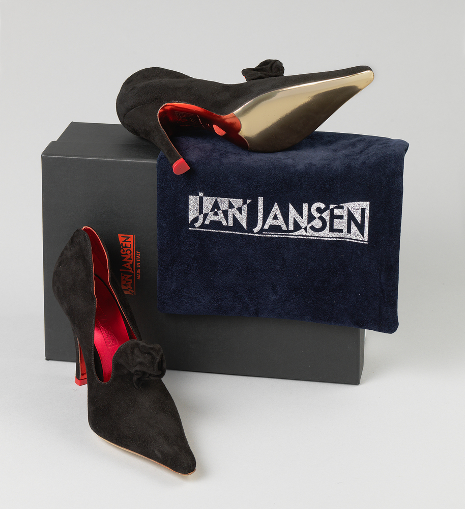 Schoenenontwerper Jan Jansen is sinds de jaren zestig een bekende naam in de Nederlandse modewereld. In 1991 maakt hij zijn eerste ontwerpen voor de schoenenserie Linea Erotica. Deze serie schoenen kent een knipoog naar erotiek, die naar voren komt in de sensuele vormen en thema’s van de pumps. Deze zwarte suede schoenen zijn een variatie op de ‘What’s this?’, een bijzondere pump met op het langgerekte voorblad een suggestief gevormd uitstulpsel, dat wel eens omschreven is als een ‘verschrompeld scrotum’. De binnenzijde van de pump is rood metallic gekleurd en in het voetbed is het logo ‘JANJANSEN’ aangebracht. De zool is half rood, half goud metallic van kleur en draagt een klein ingelegd suede hartje. De schoen is maat 38 en geproduceerd in Italië. ( Sarah Remmerts de Vries)
