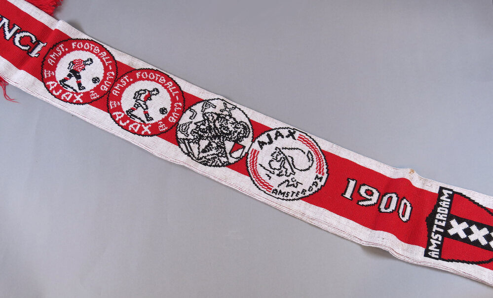 Trefwoorden accessoire, sjaal, voetbalsjaal, logo, overlijden, verdriet, rouwen, voetballen, Betondorp, Amsterdam Oost, heldenverering, Ajax, Johan Cruijff, Ajaxtextielcollectie Amsterdam Museum
