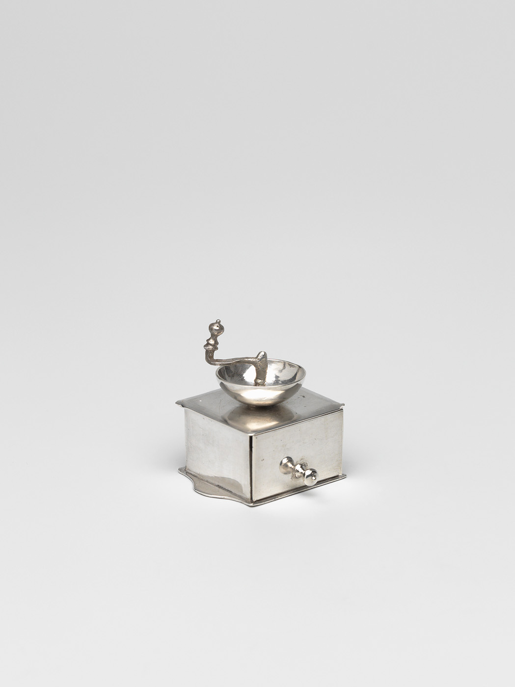 Een koffiemolen van hout en ijzer diende om thuis koffiebonen te malen. Gemalen koffie was nog niet in de handel. Het apparaat werd zittend tussen de knieën vastgehouden om bij het malen meer kracht te kunnen zetten. De molen die Van Geffen zo naturalistisch in het klein heeft nagebootst is een oermodel dat tot in de twintigste eeuw in gebruik is gebleven. De zwengel van de miniatuur kan draaien en de lade is uitneembaar, net zoals bij het grote voorbeeld. ( Bert Vreeken)