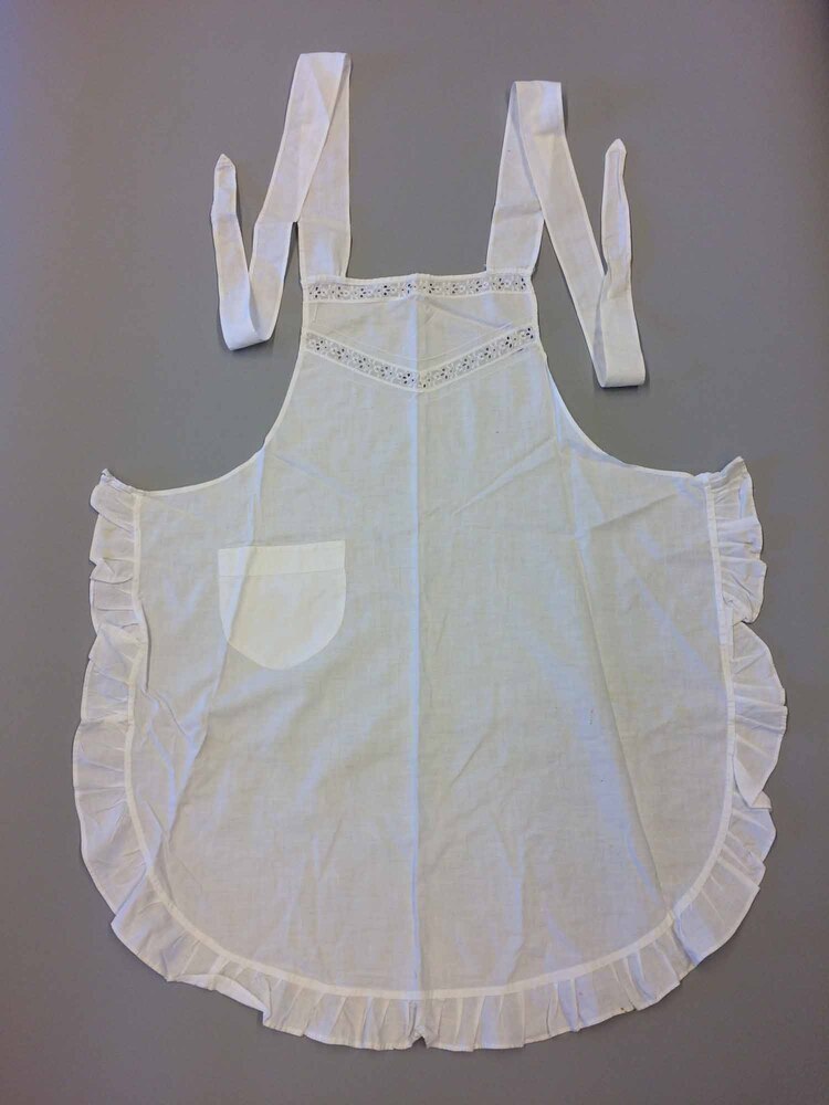 Schort van wit katoen met twee schouderbanden. Boven aan de schort is een sierrand met Engels borduursel (machinaal) gezet. Middenvoor onder de rand is een entre-deuz van dezelfde borduurstrook genaaid. Rechtsvoor een opgenaaide zak met ronde vorm. Langs de ronde kant is een strookje katoenen stof gerimpeld en vastgenaaid. Op taillehoogte links en rechts een lusje.
