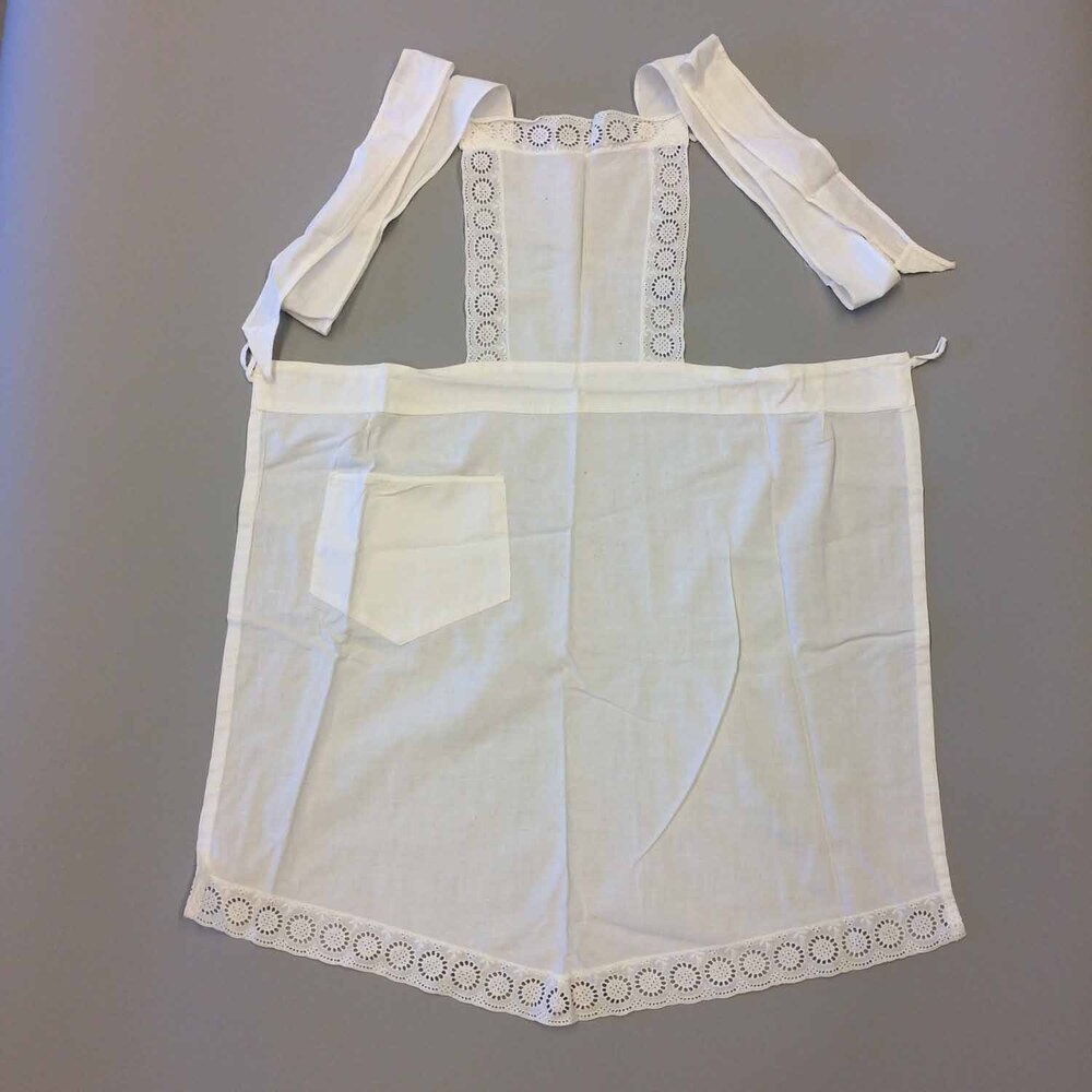 Schort van wit katoen met twee schouderbanden. Bestaande uit een borststuk en aan de tailleband een schort. Het borststuk is rechthoekig en klein. Het is vastgenaaid aan het schort. Langs de randen is een sierrand met Engels borduurwerk genaaid. Schort aan tailleband is rechthoekig en uitlopend in een lichte punt. Schort heeft rechts een zak met punt opgestikt. Langs de onderkant is eenzelfde sierrand met Engels borduurwerk genaaid.