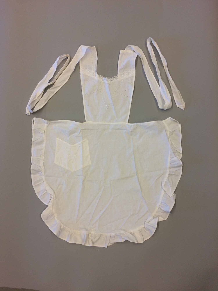 Schort van wit katoen met twee schouderbanden. Bestaande uit borststuk en schort. Boststuk bestaat uit drie delen. Een rechthoek wat smal naar de taille loopt. Langs de bovenkant is een machinaal borduurselrand gezet. Op het borststuk zijn machinaal lijnen met gaatjes gestikt. Links en rechts zijn aan de bovenkant twee brede versierde stukjes stof gezet. Ook hier machinaal gestikte gaatjes. Halfrond schort met een gerimpelde rand aangestikt. Bovenkant schort smal omgezoomd. Op het schort rechts is een zak opgestikt met onder en boven rand in V-vorm. Op de zak is in V-vorm machinaal gaatjes als sierrand gestikt. Links en rechts aan schort een bandje voor de schouderbanden.