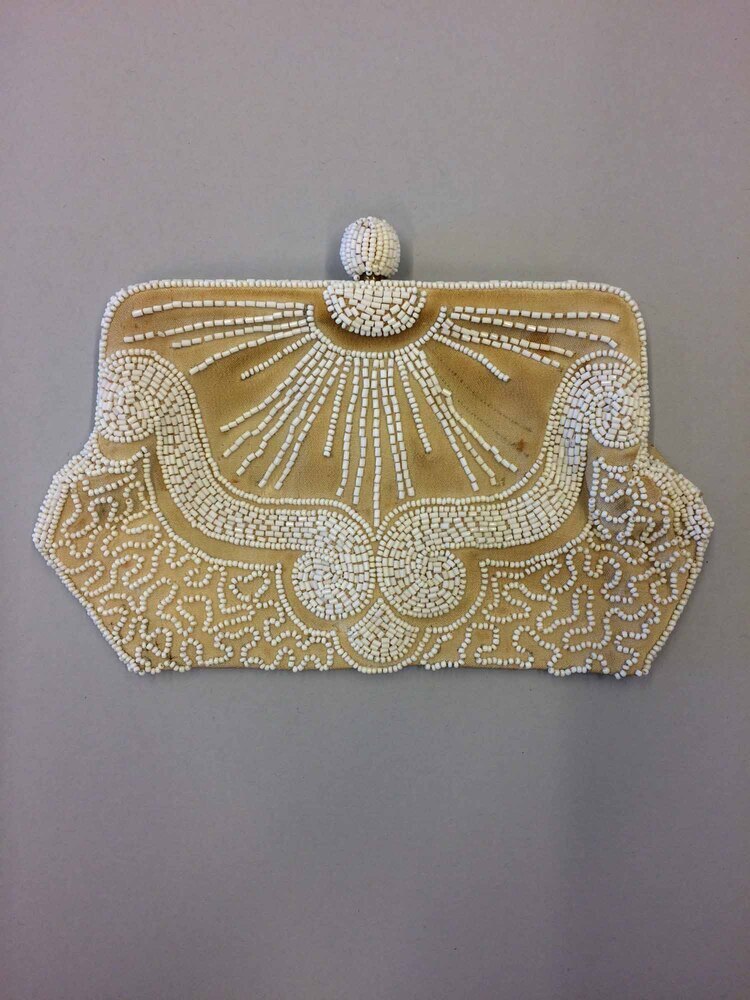Hoekig beugeltasje, zandkleurig en versierd met witte kraaltjes. De gehele beugel is met stof bekleed en aan de buitenzijde met witte ronde kralen en staafkraaltjes bekleed. Op de achterkant is links en rechts een motief door middel van kralen geborduurd.Op de voorkant van het beugeltasje is met witte kraaltjes (ronde en staafjes) geborduurd. Het patroon is symmetrisch vanaf het midden. Middenachter is verticaal een bandje van dezelfde stof genaaid om het tasje vast te kunnen houden. Dit bandje is gevoerd met een reepje kalfsleer. Langs de gehele rand van dit bandje zijn ronde witte kraaltjes vastgezet. De pastelgele voering is van acetaat. In het tasje is een rechthoekig zakje opgestikt van hetzelfde materiaal. Aan de bovenkant van het zakje is elastiek ingenaaid.