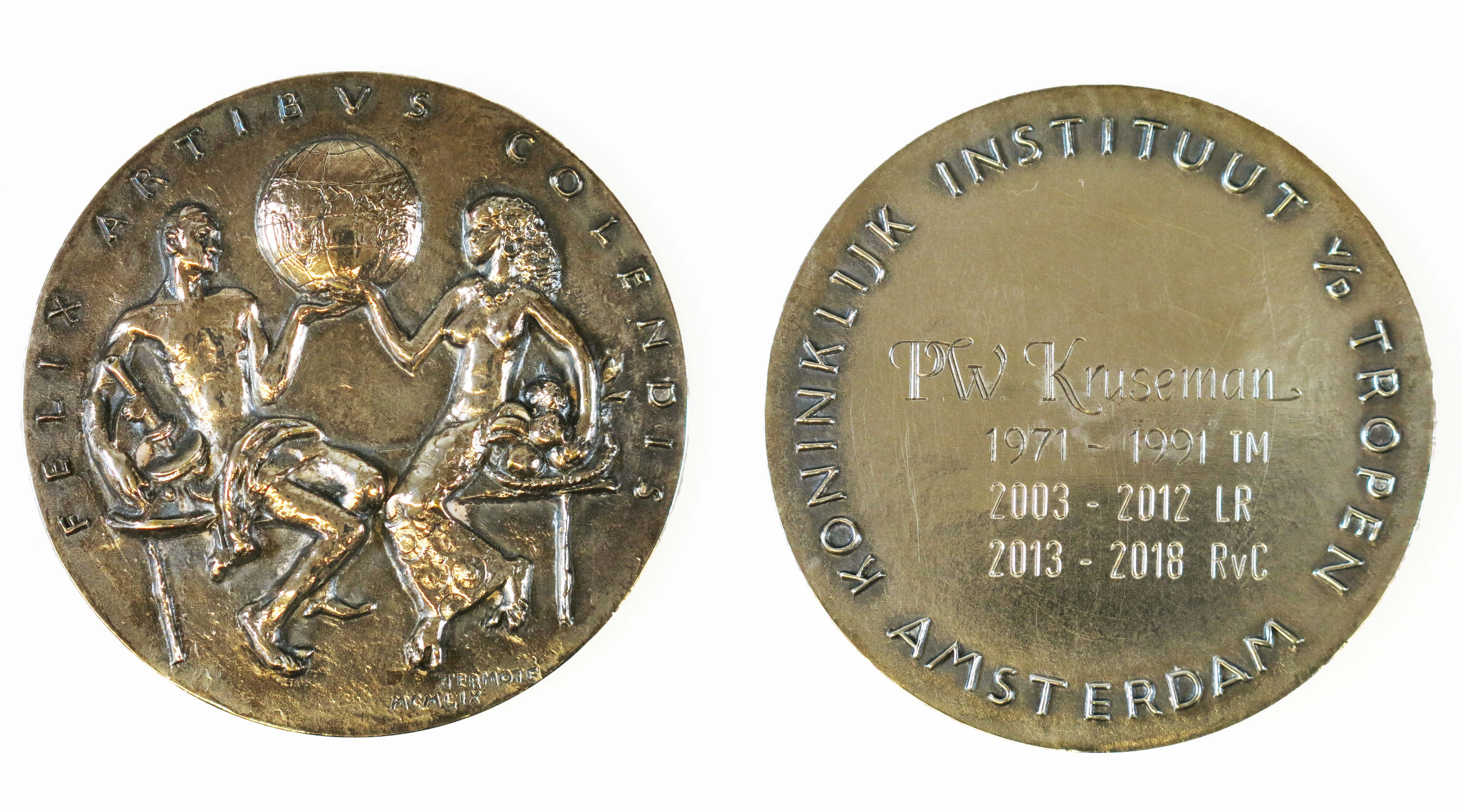 Penning uitgereikt aan Pauline Kruseman als dank voor haar verdiensten als zakelijk leider en plaatsvervangend directeur van het KIT/Tropenmuseum (1971-1991), lid van de Ledenraad van de Vereniging van het KIT (2003-2013) en als vice-voorzitter van de Raad van Commissarissen KIT (2013-2018)