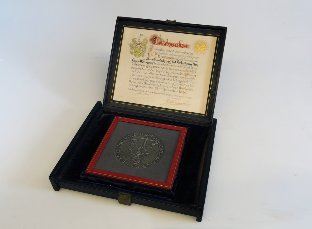 4620.2 / Doos voor erepenning van de Vereniging "Bouwmaatschappij tot verkrijging van Eigen Woningen", uitgereikt aan Mr. Jan Kruseman (1865-1949) ter gelegenheid van zijn 40-jarig jubileum als lid en voorzitter van de Commissie van Toezicht 1906-1946, incl. oorkonde