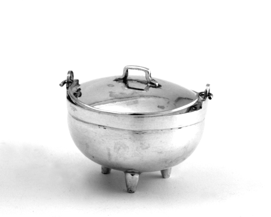 Ketel met halfbolvormig lichaam, gladde wand, staande op drie rechte pootjes, uitspringende sluitrand met een hengsel, deksel flauw gebogen en gladde U-vormige greep.
