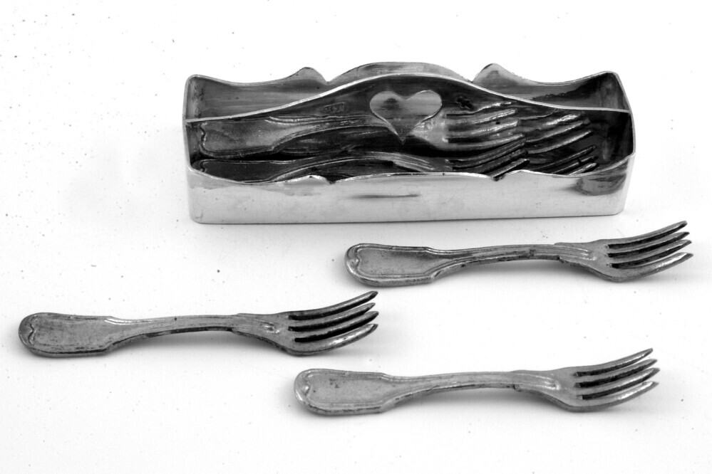 Koperen viertandige vork met spadel-vleugels, gotisch knopje, dubbele rand en enkellof.- Trefwoorden