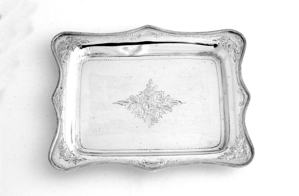 Rechthoekig blad met verdiepte, vlakke bodem; de rand gecontourneerd afgezet met een ribbelrand; in het midden en in de hoeken en in het midden van de vier zijden van de rand voorzien van graveringen in de vorm van een fantasieversiering van bloemen en langs de bodem een gegraveerde stippellijn.- Trefwoorden