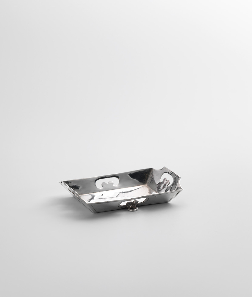Rechthoekige bak met vlakke wanden en schuin naar buiten gestelde zijden met op de buitenwand een gegraveerde lijn en niervormige uitsparingen; de beide korte zijden verhoogd en een ophangoog onder aan lange zijde.