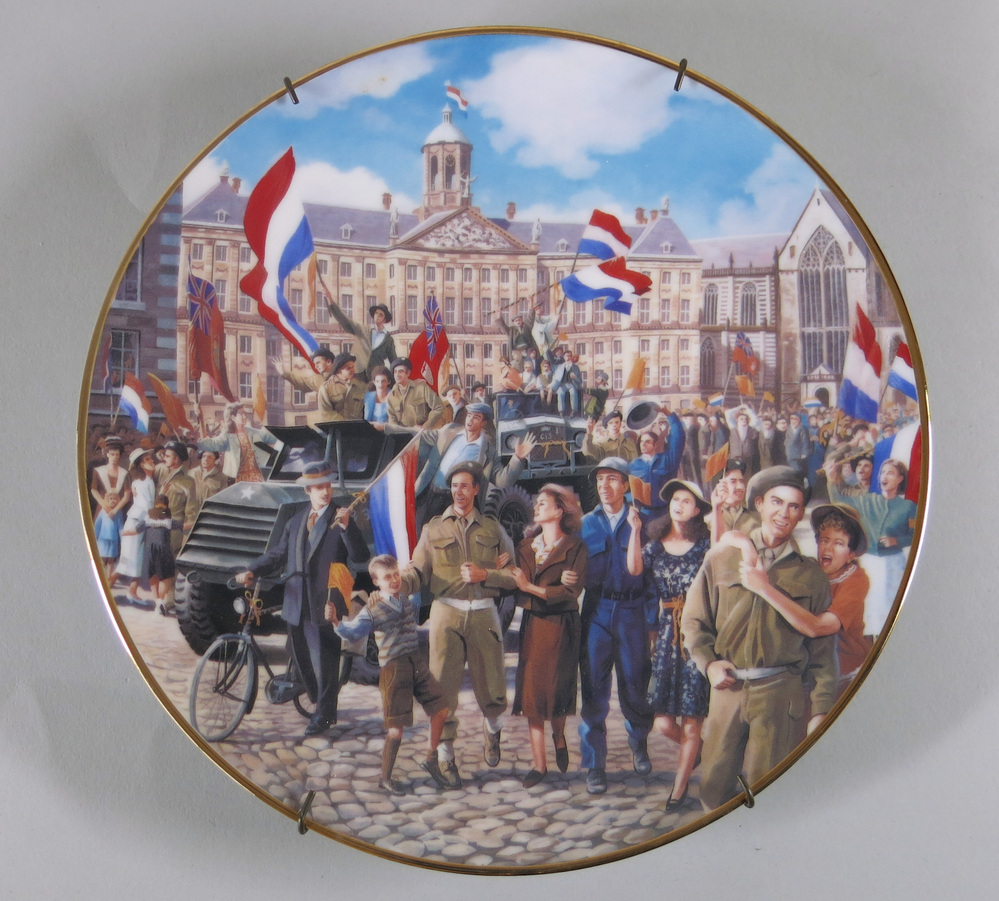 opdruk achterzijde: EEN ANBEVELING VAN FRANKLIN PORCELAIN/ De Bevrijding/ door/ Ron Hermans/ GELIMITEERDE EDITIE/ Bord nr. q91956/ FIJN PORSELEIN/